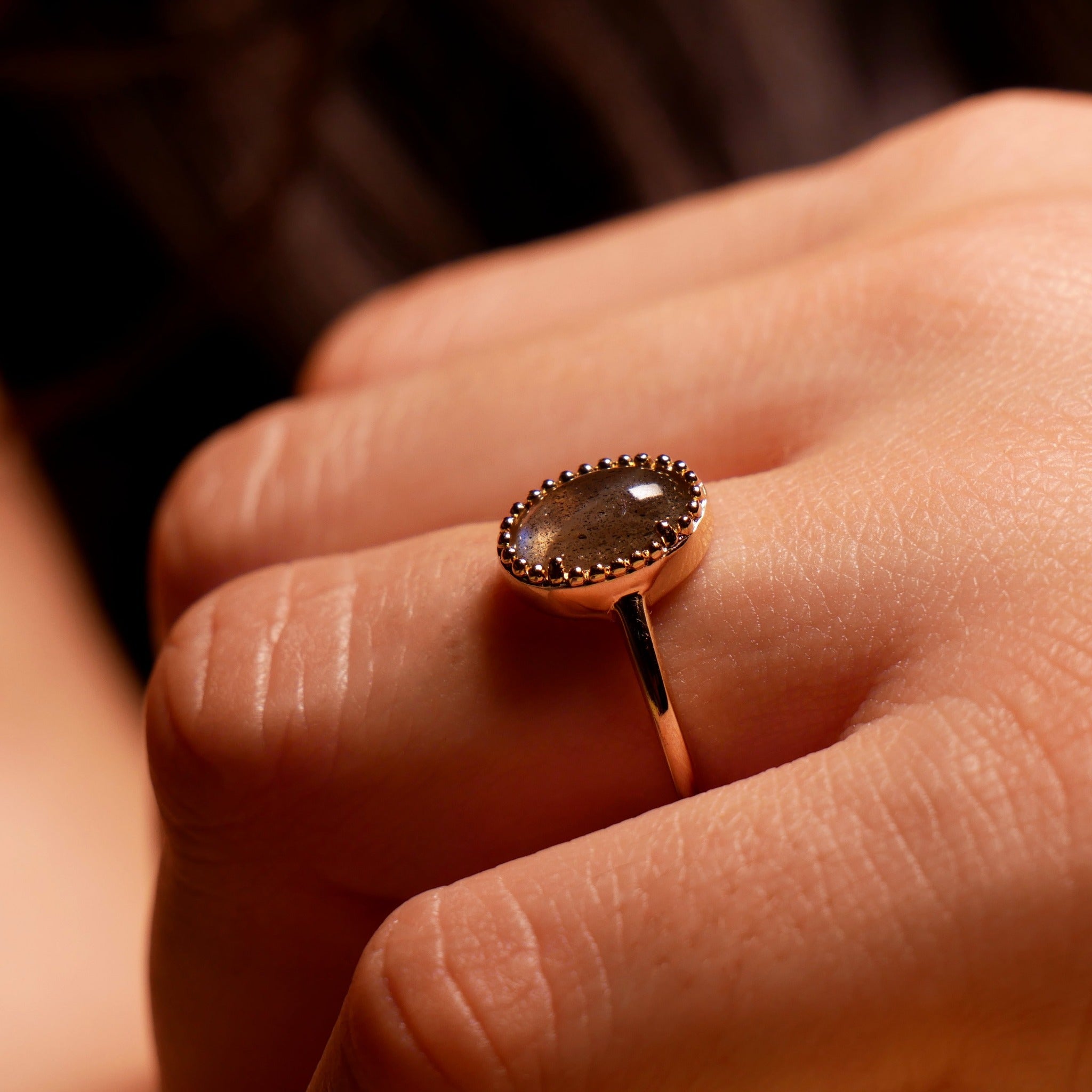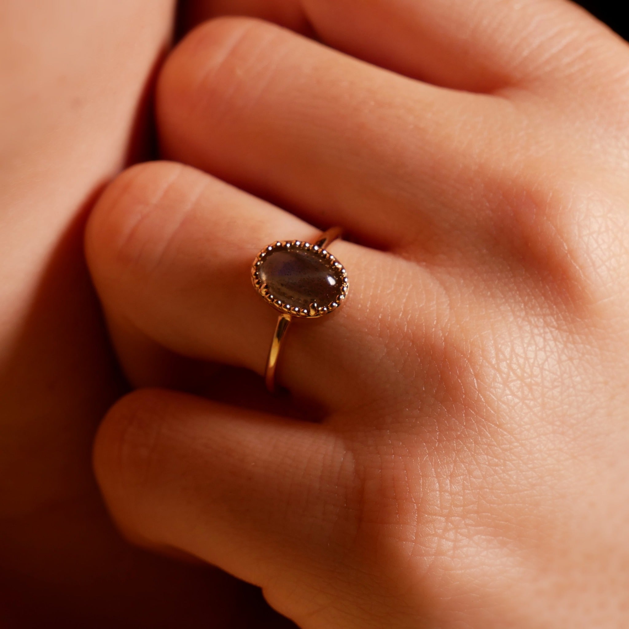 La bague ANÉMONE sertie d’une pierre naturelle en labradorite, ensoleillera votre main avec élégance. Idéal pour les femmes d’exception, cette bague allie délicatesse et raffinement.